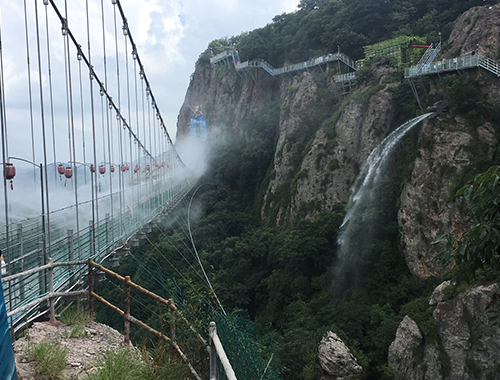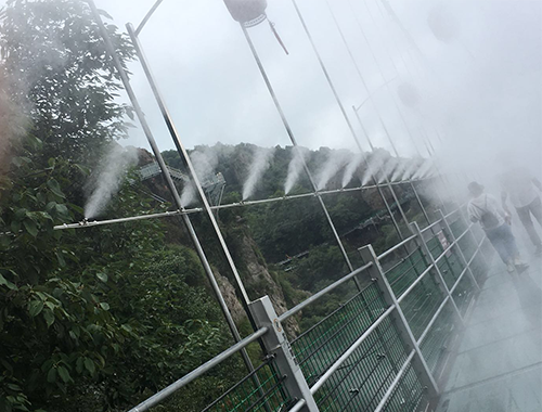 蕪湖馬仁奇峰景區(qū)飛龍玻璃橋上的人造霧系統(tǒng)是由我公司生產(chǎn)和安裝的,投入使用至今。玻璃橋上的人造霧系統(tǒng)的噴霧顆粒小,耗水量小,經(jīng)過三級水質(zhì)過濾噴射出來的噴霧營造出一種被白茫茫的云?;\罩的感覺,使云霧中的飛龍橋自帶仙氣。